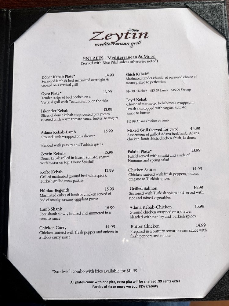 Zeytin Mediterranean Grill offers a wide variety of Mediterranean dishes in a casual yet classy setting. Located in Irving, TX, the restaurant provides vegan and vegetarian options, making it a great choice for groups or families. The menu features delicious cold appetizers like hummus, babaganoush, and dolma, as well as hot appetizers such as falafel and calamari. The red lentil soup is a must-try, cooked with Turkish spices for a flavorful experience.